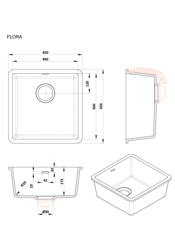 Kerrock Sink FLORA Uni 100 Arctic White With Overflow 400 x 400 x 175 mm
